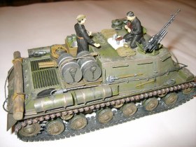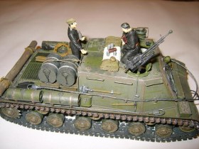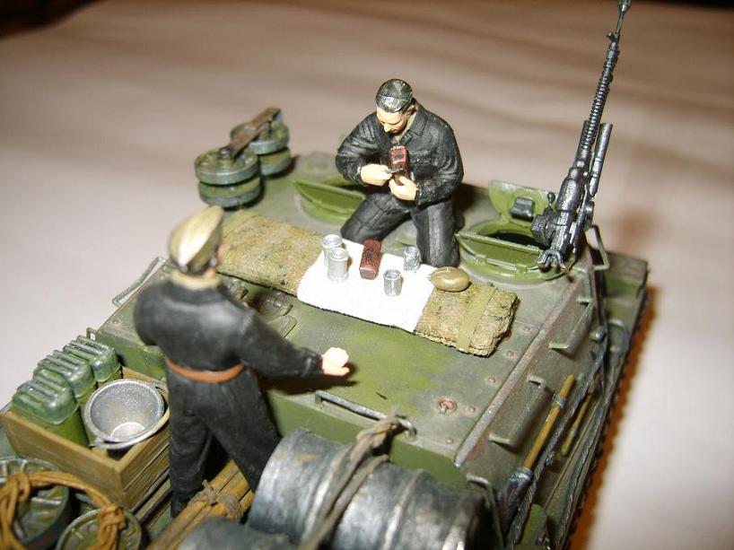 хорошее исполнение тока правый трак подкачал, или мне показалось что звенья не состыкованы? и ваще что за гусянка использовалась? Как минус - блестят фигурки, для придания матовости можна сухой кистью отработать, тогда и ткань комбезов будет матовой, и смотреться будут поношенно в боевых условиях.