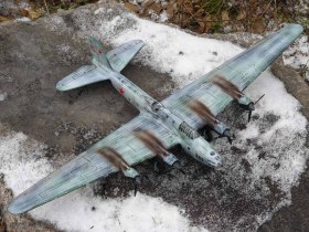 Сборку фюзеляжа начал с того, что приклеил к нему носовую часть. Из-за того что листы обшивки выполнены внахлёст, затруднена обработка клеевых швов. Благо обрабатывать много не пришлось, а там где расшивка всё же была нарушена - я восстанавливал её острым ножом методом подрезания и шабрения, на окрашенной модели восстановленные участки визуально практически не отличимые от неповреждённых участков. После окраски и тонировки внутренностей, на этапе склейки половинок фюзеляжа, столкнулся с проблемкой - они (половинки) не хотели стыковаться, образовывая зазор до 1-2мм. Возможно (и даже неизбежно) серийные отливки в сравнении с эталоном стали толще на пару десяток каждая, возможно фюзеляж, который мне достался, был слегка деформированным, но фюзеляж стыковался только в напряженном состоянии, что при склейке цианоакрилатом меня не устраивало. После подрезки пола на 1мм по ширине всё стало на свои места, шпаклёвка не понадобилась. Шов изнутри фюзеляжа был залит клеем, сбрызнут активатором и работа пошла в дальнейшем без осложнений. Стабилизатор, остекление штурманской и пилотской кабин - фюзеляж готов. Бомбы в фюзеляж не клеил, кресла были оборудованы ремнями, из баранки неиспользуемого штурвала сделал колесо аварийного выпуска шасси, на пол штурману бросил карту. Стыковка крыльев к фюзеляжу сюрпризов не принесла, напоследок приклеил киль.