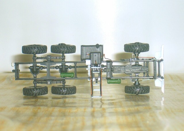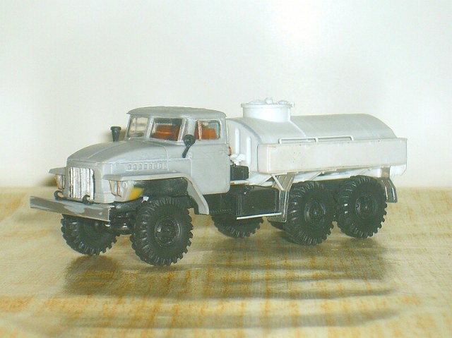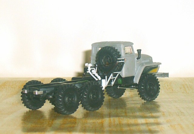 Эта модель задумывалась, как тренировочная перед постройкой бронированного Урал-4320, однако, в процессе работы я, что называется, вошёл во вкус. В результате модель получила изрядное количество непредвиденных доделок. Первым попал под раздачу бампер, он показался мне слишком грубым и был заменён самодельным из свинцовой фольги, та же участь постигла задние буфера. Далее настала очередь радиаторной решётки, вместо пластиковых прутьев я вставил полоски той же фольги. От родного ДЗК остались только боковины, всё остальное было переделано по чертежам и фото, добавлен цилиндр гидроподъёмника. Производитель даёт в наборе только один ресивер тормозной системы, второй я отлил из эпоксидной смолы. Задняя подвеска была собрана без доработок, но сохранила подвижность. В передней части рамы сделана имитация ГУРа и рулевые тяги. На топливных баках я показал видимую часть топливопроводов. Головную боль причинила установка топливного насоса цистерны: указания инструкции более чем невнятны, пришлось поломать голову и проконсультироваться со знающим человеком. При сборке кабины пришлось подкорректировать шпаклёвкой форму брызговиков в районе фар и помучаться с их ограждением. Зеркала заднего обзора оставил родные, но наклеил на них кусочки фольги и переделал их кронштейны. Во всех фарах и передних габаритных огнях были высверлены углубления, заполненные впоследствии прозрачным «Моментом супер-эпокси». Участок выхлопной трубы после глушителя сделан из иглы от шприца. Задние брызговики согнуты из той же фольги, что и бампер, подштамповки на них выдавлены толстой тупой иглой. Кроме того, из фольги вырезаны таблички номеров и знаков опасного груза. Стопсигналы я позаимствовал от бортового Урал-4320, так как собирался показать машину, прошедшую капремонт. Огни автопоезда и боковые повторители указателей поворота отштампованы в свинец из прозрачного литника. Проблесковый маячок выточен из него же. Изюминка модели – запасное колесо с выбранной сердцевиной, работы на двадцать минут, а смотрится куда лучше штатного.