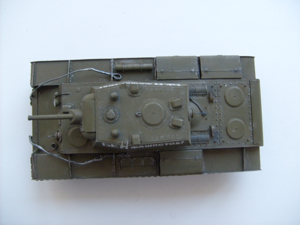 Машина неплохая получилась, хотя насчет гусей присоединяюсь к хору голосов: резину ставить не стоило. У КВ и ИС гусеницы быстро начинали провисать - то ли от тяжести траков пальцы деформировались, то ли по какой другой причине. По-моему, и декаль вот эту зря нанесли - во-первых, серебрится, во-вторых, их не столько для души, сколько для фотокорреспондентов рисовали на полчаса, пока съемка длится, в-третьих, все такие трумповские КВ из-за этой надписи как клоны. Обмотка коушей на тросах у ранних КВ и вправду была немного другая, и неплохо было бы весь трос зачернить - сейчас на нем многовато серебрянки, смотрится как алюминиевый. Та же засада с ящиками для барахла - в тех нечастых случаях, когда краску продирали до металла, железяка отсвечивала таким графитовым темно-серым. Хорошо бы немножко пыли и хотя бы чуть-чуть обозначить следы ног на крыше башни и корпуса.