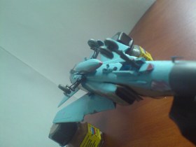 Сразу хочу сказать, что это моя первая модель, и потому она изобилует косяками. Отсутствие хоть какого-либо опыта не позволяет мне выставить данную модель дальше песочницы. Модель собиралась на протяжении двух недель, покрашена кистью звездовским акрилом, сопло "металлизировал" с помощью графитового карандаша, пришлось достаточно потрудиться, чтобы выровнить с помощью шпаклевки огромную ступень, возникшую после соединения передней и задней частей истребителя. Доработок не делал, только добавил в задние шасси стойки из спичек, закрывающие люки. Вооружение решил не вешать. Декали немного затонировал. Жду самых критических оценок и приношу извинения за ужасные фоты - других сделать не получилось...