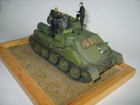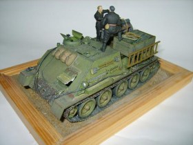 Покопавшись в инете и раздобыв незначительную, только описательную информацию об использовании в качестве танкового тягача машины на базе СУ-100, решил воплотить свой задум в реальность. Итак, предлагаю Вашему вниманию модель танкового тягача СУ-100Т. База модели -- СУ-100 от Звезды (М 1/35), модель дополнена наборными траками и двигателем В-2 от Макета, фигурами от МИНИ АРТа, аксессуарами от АКАДЕМИИ и МАСШТАБА, плюс самодельные приспособления.