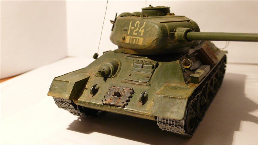вторая моя попытка собрать эту 34-ку от звезды. Красил красками звезды, кистью, пылил ихним же акрилом. Гусеницы макет, еще добавил крепление бака и антенну.