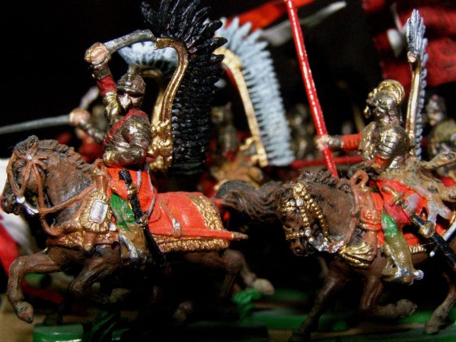 Крылатые гусары- здорово! Особенно с копьём наперевес и в солнечных очках ! Конные терминаторы. А если серьёзно, то фотографии надо переделать. Большую часть работы или тьма поглотила, или вспышка высветлила. Матовым лаком не покрывали? Краска сильный блеск дала и глаза поменьше. Удачи. deLoro.