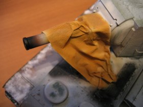 Туалетная бумага, изображающая брезент, в принципе не подходит по фактуре и не прокрашена по краям. А действительно, зачем она там? Неужели наши танкисты так сильно испугались? Про цвет сказали.