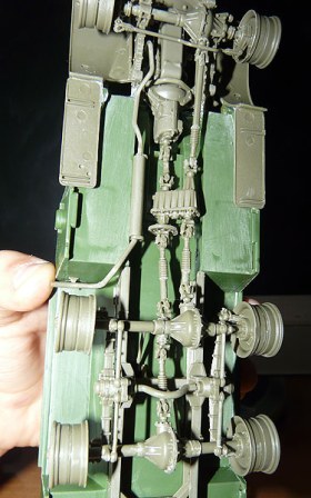 Ходовая от Трампа сделана также не в пример аккуратнее родной СКИФовской (из-за нее собственно и покупался ЗИЛ). Вначале приклеил мосты-рессоры, затем вклеивались карданные валы (валы, идущие с промежуточной опоры на раздатку и с переднего моста на нее же, пришлось разрезать, удалить миллиметра по 3 и склеить снова - иначе не влезали). В общем, получилось так.