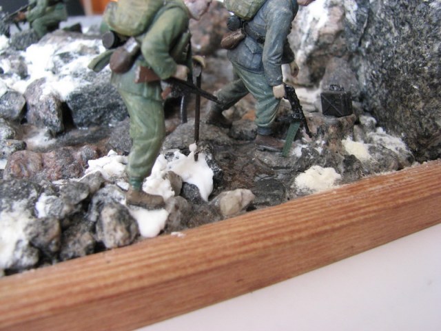 Доброго времени суток коллеги, решил еще одно свое творение выставить (пока оно не покрылось толстым слоем пыли. Набор горных стрелков от Драгона. По задумке конец войны: Уже понятно, что сопротивление бесполезно и надо спасать свою шкуру прихватив с собой либо секретный архивчик, либо чемоданчик с награбленными драгоценностями……и деру в «новую светлую жизнь» на службу к новым хозяевам. Этим и занялся один из офицеров германской армии (толстяк в каске) прихватив своего ординарца, а в сопровождающие взяты два горных стрелка. Группы специально старался сделать по разному – егеря ребята тренированные и по горам им шастать привычные ( они и посвежей и чище), а два крысенка не привыкли к тяготам горной войны поэтому и погрязней и более «замотанные» тяжкими переходами. После небольшого привала у водопада они отправляются дальше. Камрад с пулеметом прикрывает отход, а боец со снайперской винтовкой осматривает перевал. Терзают их смутные сомнения, что идут у них по следу наши бойцы)), которым нужна коробка с архивом который тащит толстяк)).