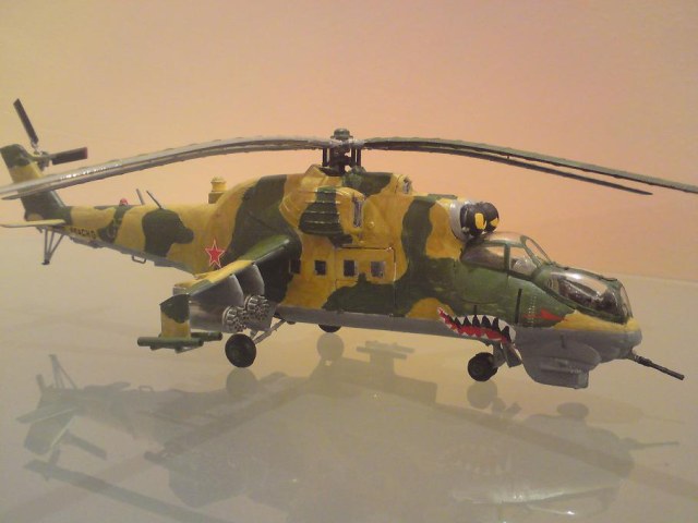 Гнутые лопасти тоже косяк производителя?Слишком перегнули...Да и над втулкой НВ работы непочатый край похорошему...А в общем и целом наверняка еще будете делать такой же,но в новом качестве...Постарайтесь найти фото этой машины,чем больше,тем лучше,если найдете травление и резиновые колеса только плюс...Нанесите хоть немножко расшивки,тонировка оживит модель невероятно!Сделайте фару с левого борта,выхлоп ВСУ,да и кучу другого...Советую красить аэром и пользоваться для основных цветов всем,только не звездой!Начинающим всегда 5+ на будующее...