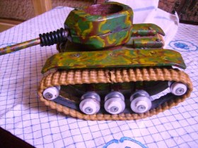 Всем доброго времени суток! вот нашел свой старый танк,сделанный моим отцом лет 10 назад))) танк сделан из дерева, местами металла. гусиницы сделаны из обычного жгута которого можно купить в аптеке) катки были сделаны на заказ у знакомых. конечно это не стендовая модель но вот решил просто выставить творение отца) на его счету в принципе много еще деревянных игрушек вырезанных из дерева для меня в детстве для игр) это такие игрушки как: поезда,солдатики,машинки,корабли) вот но нашлось только это)