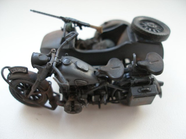 Вообще-то стыки пресс-форм не зачищены не только на пулемёте. Номерной знак на переднем крыле следовало сточить до масштабной толщины, а лучше срезать и поставить самодельный. И не мешало бы изобразить спидометр на корпусе фары, покрасить эмблемму BMW на баке. Благодаря старению и брезенту в коляске модель в целом выглядит неплохо.