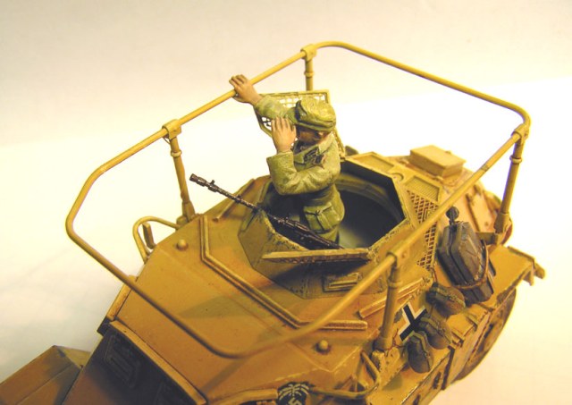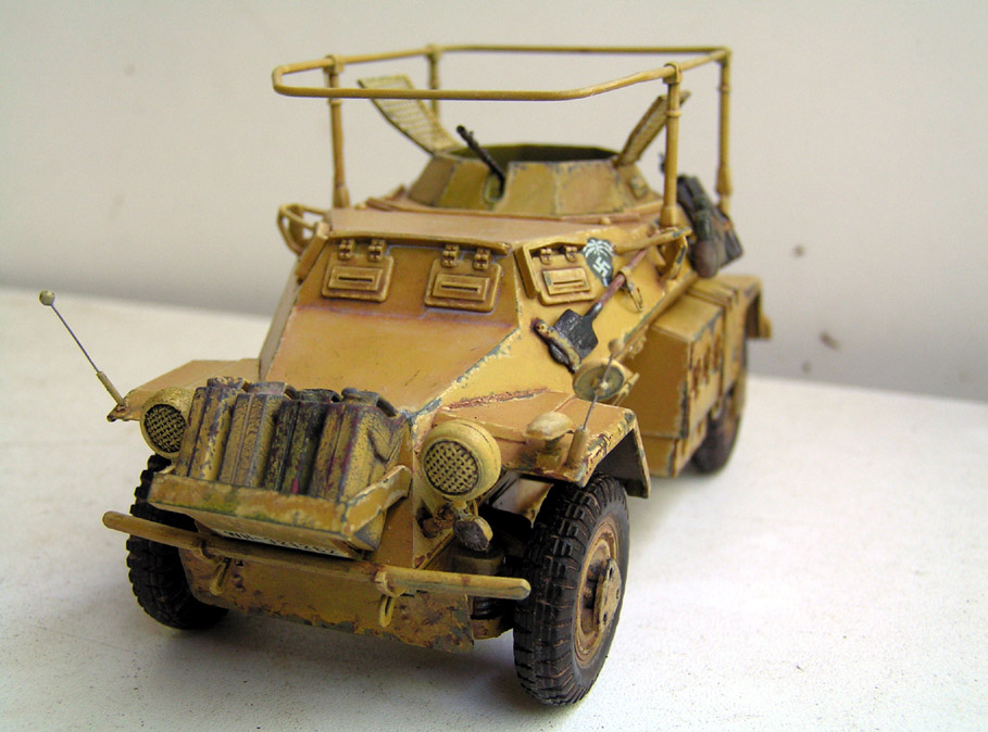 Представляю модель Sd. Kfz. 223. Эти бронеавтомобили воевали на всех фронтах Второй Мировой войны. Особенно были любимы Роммелем как разведчики. Единственным их недостатком в пустыне был ограниченный запас хода, в связи с чем экипаж таскал на броне канистры с дополнительным запасом топлива.