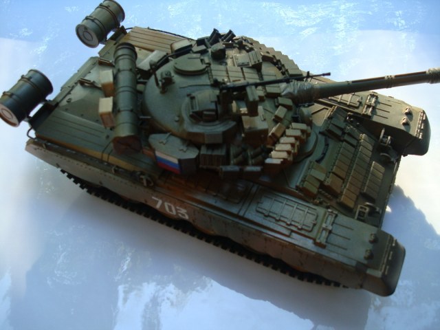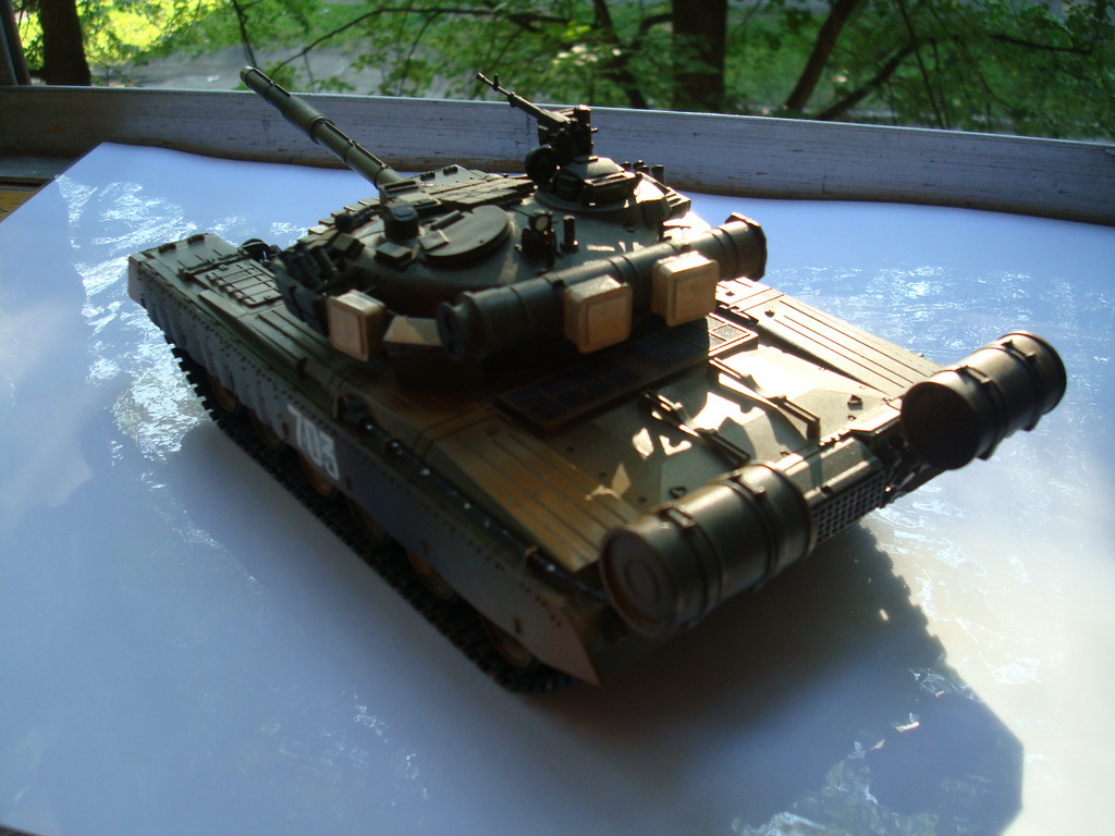 ДЗ криво собрана, причем с элементами фантазии и некоторого некомплекта. Окраска по цветам больше подходит для японской армии самообороны. Катки загадочно окрашены. И вообще, звездовский т-80 искоропки напоминает оргинал только издалека и в темноте, т.к. весь является одной большой трудностью (а не 3 блока ). С чего вдруг там флаг? На том месте должен быть круглый фланец с 4-мя болтами. 3.