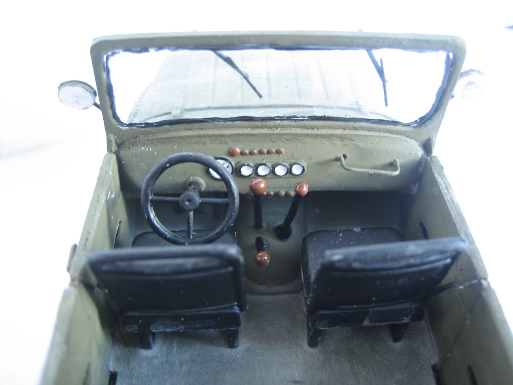 Когда открыл коробку - ужаснулся! Таких дров я ещё не видал! Единственное что меня удивило что в комплект к таким дровам входили в общем то не плохого качества резиновые покрышки! Точить нужно было каждую деталь везде, без преувеличения, некоторые детали заменил, некоторые даже не стал использовать, отдельных слов достойны стёкла… Стёкла это просто тихий ужас, ни одного стекла не использовал из набора… По ходу работы сделал стёкла заднего вида, дворники, петли для тента (но они больше для декоративного значения), все фары сделаны при помощи Эльфа… Заменил руль, заменил рычаги, ручки на дверях, сделал ручки запора задней двери и колеса, сделал брызговики, бросил сзади ящик и пулемётные короба (Танк), и восточного экспресса канистру… Стекло из пластика из которого делают CD. Пытался сделать резиновый уплотнитель между рамой и стеклом, получилось очень плоха, дрожат руки(((