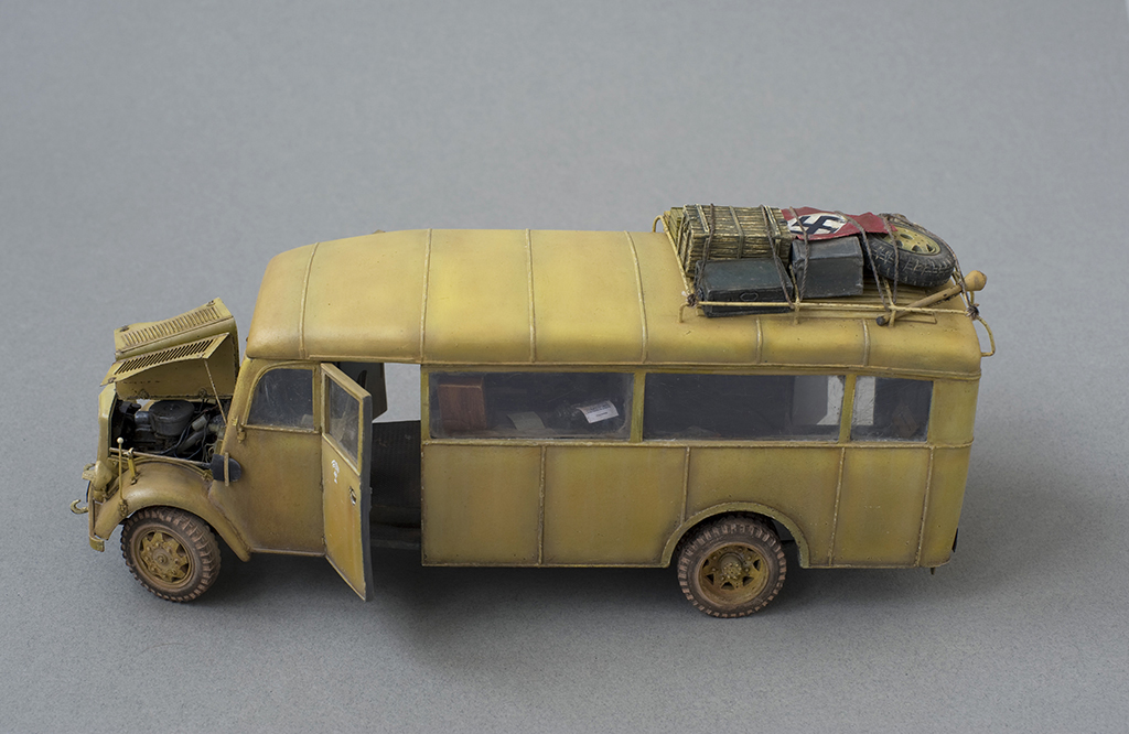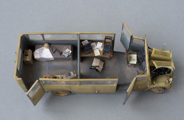 Шедевр! Единственное, на что я хотел бы обратить внимание, так это на несоответствие пустоты внутреннего убранства и внешних тюков на крыше автобуса. И для штабного автобуса катастрофически не хватает... кип с документами, картами или папок с различными "делами".
