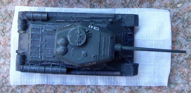 Доброго времени суток. Вот наконец-то появилась возможность выложить фото своей, можно сказать, первой модели (первой, не считая нескольких собранных в 12 лет с братом некрашенных моделей и одной крашенной первый раз в жизни). Танк делался в подарок дедушке (он на нем служил в конце 60-х годов). Со своей задачей танк справился хорошо, т.е. дедушке понравился, а это я считаю главным.