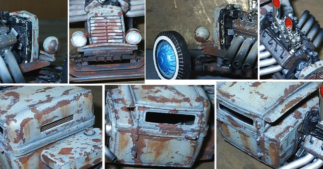 Разнообразие аксессуаров намного больше чем у хот родов, переключатели кпп могут быть сделаны из старого ружья или из ржавой арматурины высотой до потолка и с черепом на верхушке. Решетку радиатора можно обмотать колючей проволокой, руль сварить из цепей, вместо эмблемы на капоте повесить череп животного, вобщем все, на что хватит фантазии и смелости.