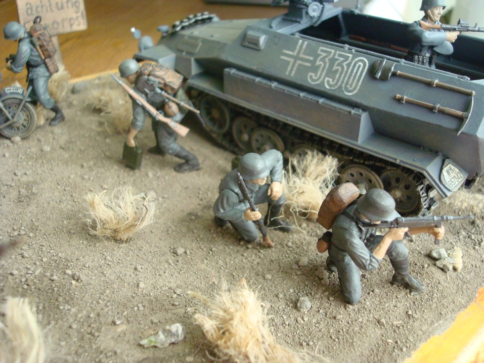 ))) А мне очень понравилась.. сам в первой своей диораме с сыном использовали Ханомаг и штурмпионеров.. Особенно тот что со шмайсером, - очень динамичен..) А тот что тащит мины, я ему в руку МГ вставил..)