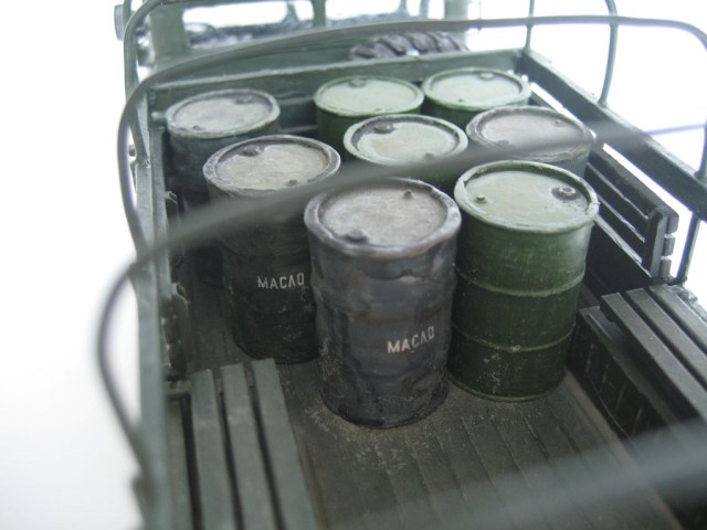 Собирался естественно легче и быстрее чем первый, но постичь тайны крепления печки в салоне я так и не смог снова выкинул её к чертям… Сделал несколько доделок глядя на фото данного агрегата и чей то модели найденной в недрах сети… Итак: дуги из проволоки, подножки и брызговики под кабиной их пластика знаменитой лапшички доширак, усугубив свой гастрит я решил сделать ещё трос из капроновой нити, переделал все фары (ЭЛЬФ), сделал номерок задний на брызговике, намотал немного изоленты на конец выхлопной трубы, получилась на мой взгляд настоящая труба… В отличие от предыдущей модели покрасил интерьер кабины, не стал жоска как в прошлый раз пачкать, немного запылил и на этом остановился. Всё красил кистями звездой супер и акрил, цвет замесил из нескольких цветов супер… Немного шпатлёвки… Да ещё, штатное лобовое стекло с дефектом, не стал его менять поставил так, и не пожалел, дефект очень похож на трещину в стекле… Бочки от восточного якспресу решил поставить вместо ЗУ (пущай лежит до лучших времён) Помучался я с ними но вроде вышли ничего, шпатлёвки ушло много, наклеил декали на них из запасов, не знаю пишут ли в реале на бочках что там или нет, но мне кажется так интересней…