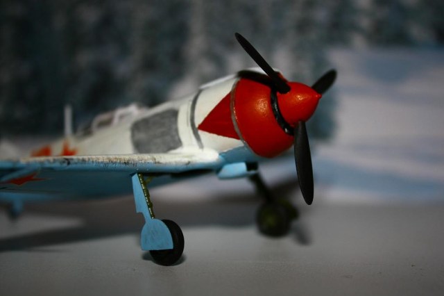 Всем Привет. Ну, что, вот мой ла. Собирал не долго, можно сказать учился на нём красить. Самолёт хороший, единственно пилот в кабину не помещался пришлось без него. Чем только не красил, поэтому и стекло испортил, не оттираеся, прошу сильно не бить, а помочь в покраске. Очень вас прошу помогите, потому, что ну просто замучался. Использовал шпатлёвку. Пытался сделать самолёт Кожедубы, по окраске такой-же, единственно не нашёл 62 маленькие звёздочки на борт, ну судите.