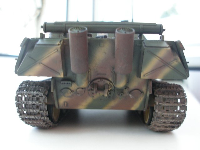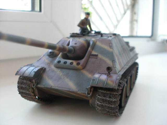 Понравилась окраска и тонировка корпуса и ходовой, из замеченного: нехватает малость припыленности гусениц , добавить ржавчины на них немного, и дорожку от катков, а то они смотрятся слишком чистыми с голым металлом (хотя на виде с кормы все отлично, может просто не все обработано?). Ну и танкист такое ощущение греет левую руку над бронировкой вентиляции. А в остальном отлично. Про матчасть говорить не буду так как про Ягдпантеру ни чего не знаю.