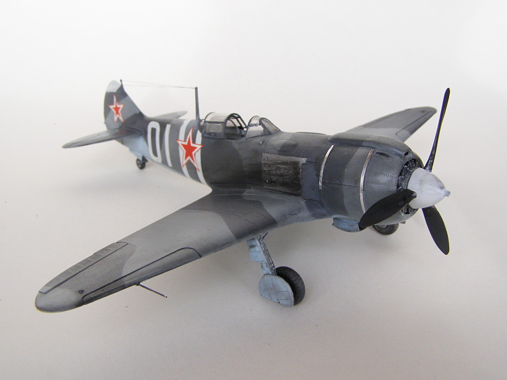Выставляю свою первую модель авиации. Поскольку не имею вообще никакого опыта в постройке авиации, делал долго и конечно ошибок найдется предостаточно. Для эксперимента взял Ла-5ФН от "Звезды" в масштабе 1/48. Точной привязки к прототипу не делал, собирал один из предлагающихся вариантов - самолет Героя Советского Союза капитана Попова В.И. 5 ГвИАП, 11-я ГвИАД, 2-й ГвШАК, 1 Украинский фронт, осень 1941 г. Сборка проблем не вызывала, кое-где потребовалось немного шпаклевки. От себя добавил тормозные шланги на шасси, иммитировал привязные ремни, антена из капроновой нити. Окраска аэрографом акрилом "Звезда", выделение расшивки "пастель на фейри", тонировка полностью пастелями.