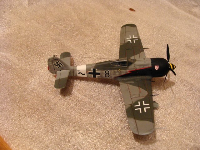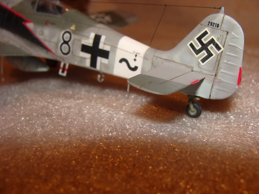 С дебютом! В общем как бы неплохо. Единственно чёрный цвет слишком радикален. Высветлять нужно с учётом масштаба, износа, выгорания и т.д. Винты у немцев чёрно-зелёные. Вообще литературу изучали видимо не достаточно долго. Вариант А-8/R8 товарисча Вилли Максимыча подразумевает 30 мм пушки в крыле и накладное бронирование кабины и фонаря. На фонаре, правда, брони не видно. К тому же на фото видно, что фюзеляжный крест с серой серцевиной... Поэтому если не хотелось ни каких доработок, то вариант нужно было выбрать другой. Ну это наживное. Дерзайте! Удачи!