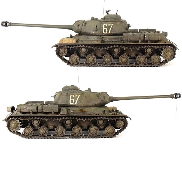 - корпус от ИСУ-152 «Звезда» (по причине наиболее точного воспроизведения крыши МТО, чем на ИС-2 того же производителя); балансиры, упоры балансиров, звездочки ведущих колес, поддерживающие катки, люк комбашенки, колпак вентилятора, смотровые приборы и некоторая мелкая деталировка от этого же кита с доделками и переделками;