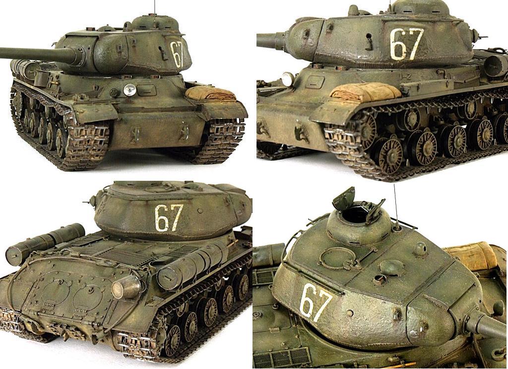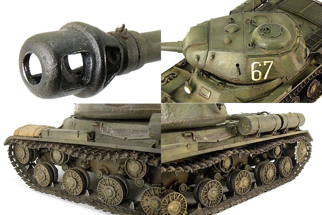 - катки, колпаки ведущих колес и поддерживающих катков, механизм натяжения гусениц, деталировка днища, бронеровка курсового пулемета, бронеровка выводов выхлопных газов, маска башни, маска ствола орудия, шарнир орудия, детали бронирования кормового башенного пулемета - копии деталей ИС-2 «Тамия».
