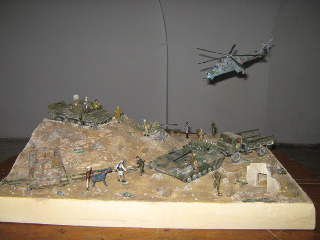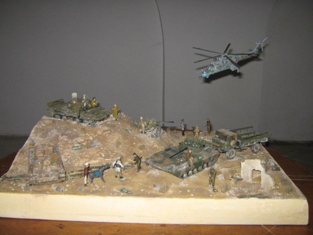 Первый опыт в постройке диорам, сюжет на вольную тему по заказу городского Союза войнов - интернационалистов и передана заказчику в городской музей. Времени на диораму было выделено маловато по этому не всё получилось как хотелось.