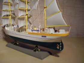 В прошлом году барк "Мирча" приходил в Америку.В Бостоне мне впервые удалось на него посмотреть. Некоторая информация: палуба - тиковая(соответственно цвет),гальюнная фигура - князь Мирча(описать не могу,пороюсь в фотка, если найду,то опубликую),штурвал изящный,но увы очень маленький(около 60см диаметр). Всё остальное соответствует.Кораблик красивый.Мне понравился. У моей мамы стоят таких два(имею в виду кораблики этой же серии.Она была посвящена гонке 1976 года, в которой как вы знаете победил наш "Товарищ"