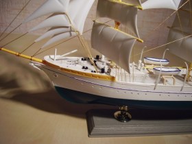 "Хуан Себастиан де Елькано" и "Товарищ". Кстати фирма-производитель,кажется это "Тамайя",делала все детали соответствующего цвета. В вашу защиту о выделении парусов:увы очень трудно, хотя,мысля современными мерками(а Товарищ и Де Елькано я делал в 90-м),наверное будет хорошо добавить лак,который делает поверхность матовой.
