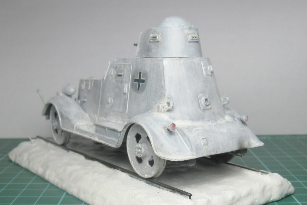 Досталась мне дрезина в коробке от Алангера. Из переделок: заменен пулемет на MG и соответственно маска под него; фары хотел сделать "стеклянными", но прозрачный состав запузырился :( поэтому залепил их "снегом".