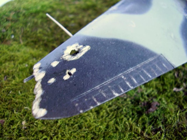 Для придания нынешнего вида, модель пришлось немного "покурочить" Часть рулей высоты и создания просматривающегося внутреннего каркаса крыла было выполнето из скрепок и жести. Фонарь пришлось разрезать, для придания открытого вида кабины. Слишком толстое оказалось литьё стекла, поэтому если присмотреться - теряется ощущение реального вида остекления. Но пока я не научился изготавливать стекло сам, пришлось пользоваться тем что есть. Проблем в изготовлении отверстий от пуль не испытал. Единственное придал краям дырок соответствующий вид.