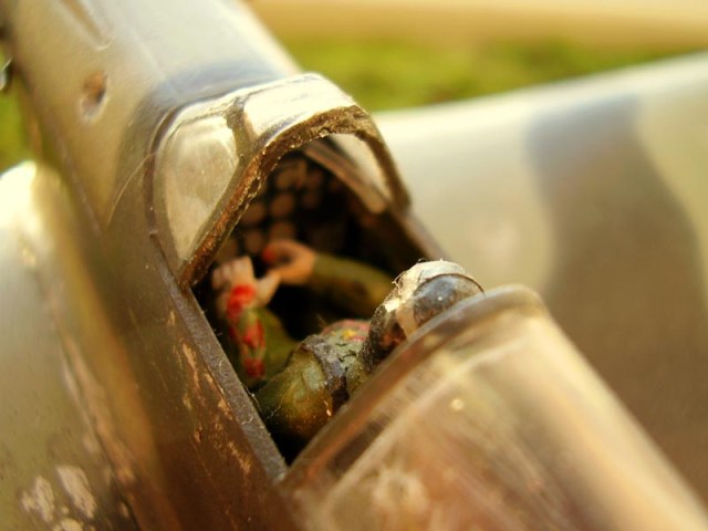 Повреждения выглядят очень здорово, наверное много труда вложено. А вот при этом видеть не обработанный шов половин фюзеляжа и серебрящиеся деки просто обидно.