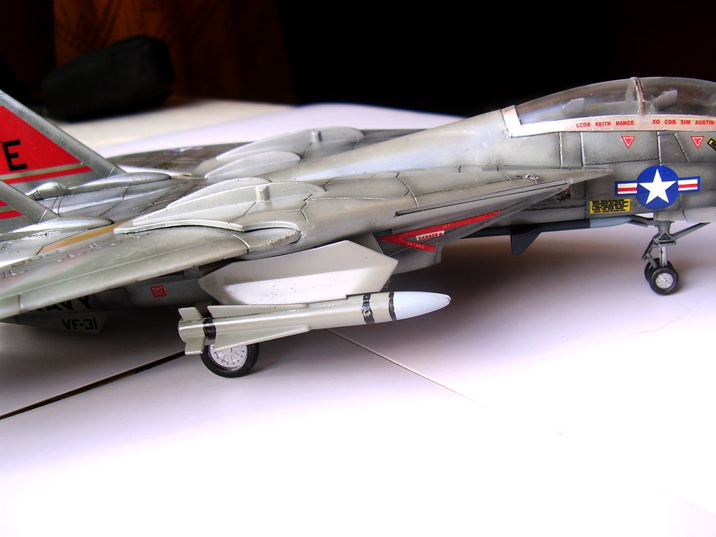 По окраске тоже есть косяки - ракеты ни одна не понравилась, на Фениксах кривоватые линии - совет - купить декаль, навроде технички для бомб и ракет, и оттуда брать эти линии. Или со старых обрезков декали - там обычно "каемочка" такая есть по контуру - можно ее попробовать. Или маски класть.
