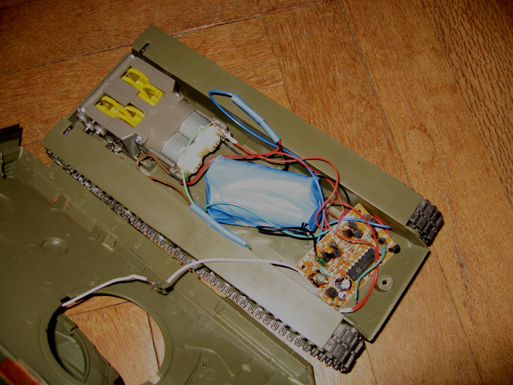 Модель мне не очень понравилась. Не самая качественная подгонка деталей - щели в местах стыковки верха корпуса с боковыми панелями в местах где лючки. Когда начал красить, вдобавок, быстро понял что покраской я впечатление не исправлю, потому что не умею этого делать хорошо. Тогда же и появилась мысль сделать его на РУ, чтобы было, так сказать, чем похвастать. РУ от китайской машинки. У машинки также были фары, светящиеся при езде, одну из них вставил в прожектор на башне.