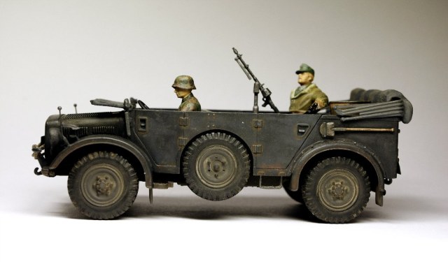 Суперское эсесовское ауди! Тамия сделала собирательный образ между типом 1а и тип 40. Но это не важно! Затонировано отлично! Чувствуется железо. Из мелочей - переборки..... толстоваты.... вернее их вообще не было. Каркас тента схематичный, и тент...... Фотки отличные, только на автомобилях поверхности надо бы полировать..... Всё таки ауди, как ни как! . Автору респект! Работы по своему хорьху - буду форсировать, но не уверен, что достигну Вашего уровня!