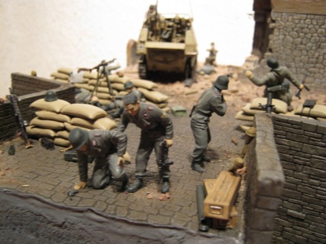По поводу немцев с громадным боевым опытом - не путайте, это 1944,немцы деморализованы, полная неразбериха в обмундировании, ветераны в основном кормят червей, и поскольку на диораме не СС-овцы(чистокровные немцы под присягой), то это гренадёры собранные из военнообязанных людей с захваченных территорий т.е с достаточно низким моральным духом и часто без боевого опыта. Такие обычно сдавались полками.