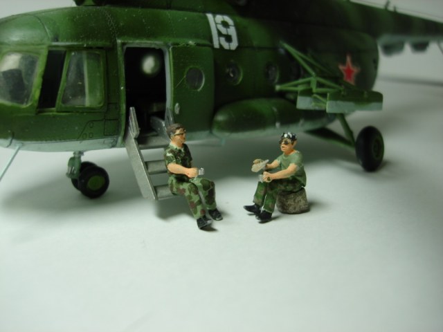 Приглянулся мне как-то Ми-8, который я интернировал у ребенка, модель не красилась, поэтому с реанимацией проблемы были только в придании более-менее божеского вида втулке винта- видно очень много раз переклееной и добавлением недостающих распорок на пилонах. Процесс занял дня 3, ибо куллеры не моя тема. Решил поизвращаться добавив пару хасегавовских водителей, предварительно превратив их в бухающих после вылета, а может и просто так пилотов. Со временем сделаю из этого диорамку, поэтому вертушку еше не старил, не пылил и окрас пилотов только примерный. ловлю табуреты, тухлые помидоры и прочее, что попадется вам под руку:)
