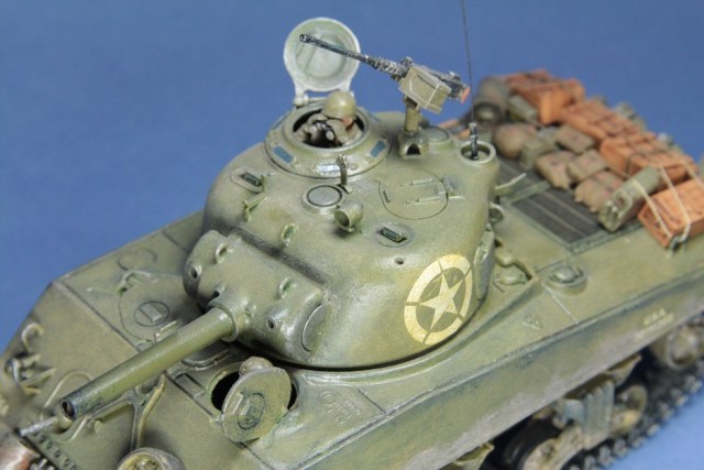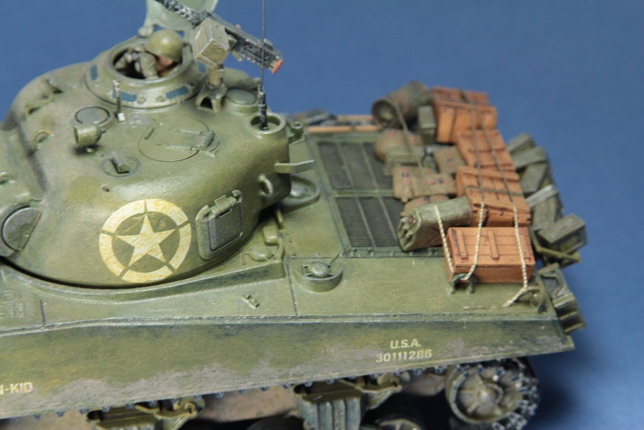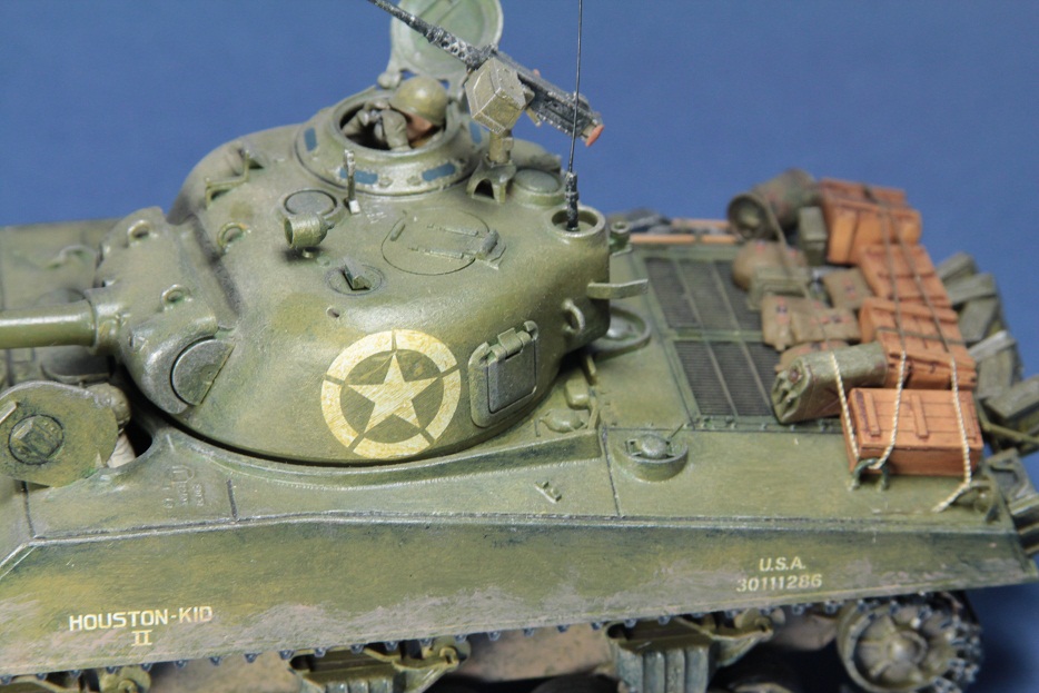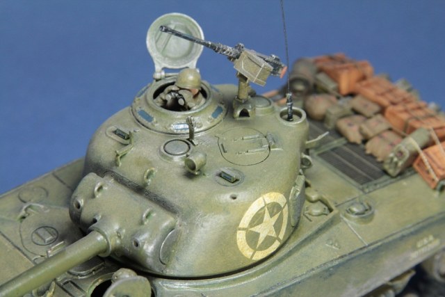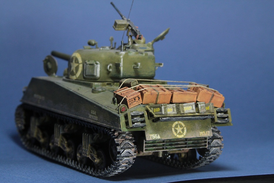 Во первых полностью прототип называется М4А3(105). По модели: Качество фото.Перископы комбашенки закрашены зеленым. На люке командира нет внутренней части перископа. Все ручки и скобы надо было заменить на провочные. Грязнение-неестественное. Во впадинах девственно чисто, а выступающие и трущиеся поверхности наоборот в грязи. Амуниция навалена как попало, слетит на первом повороте.