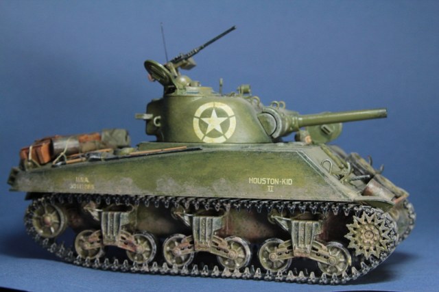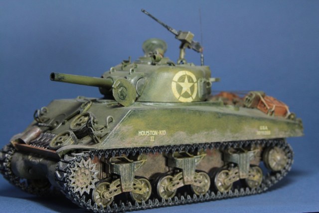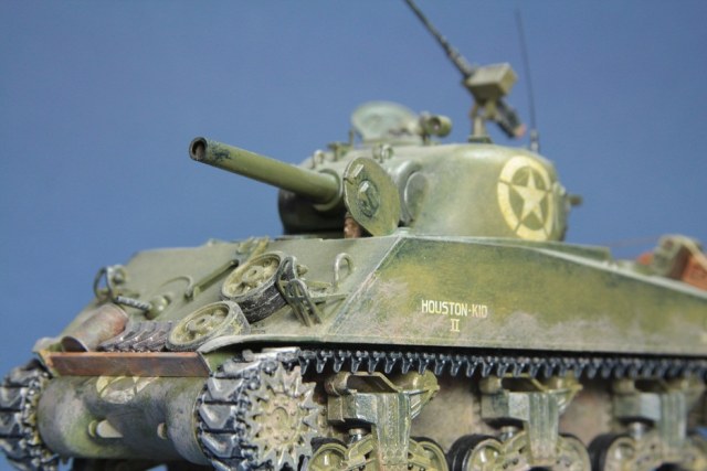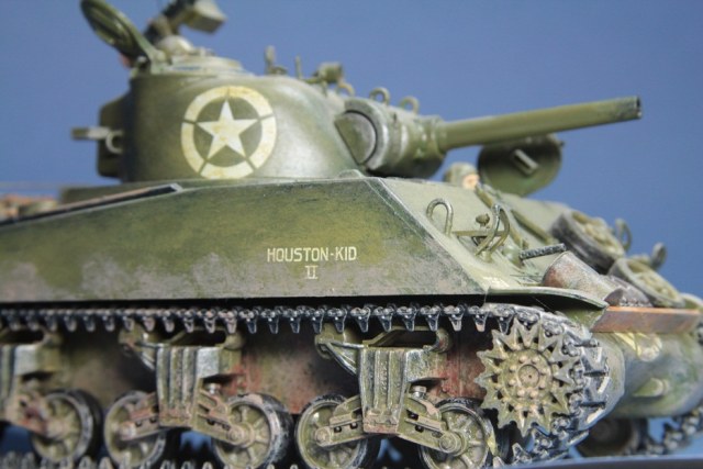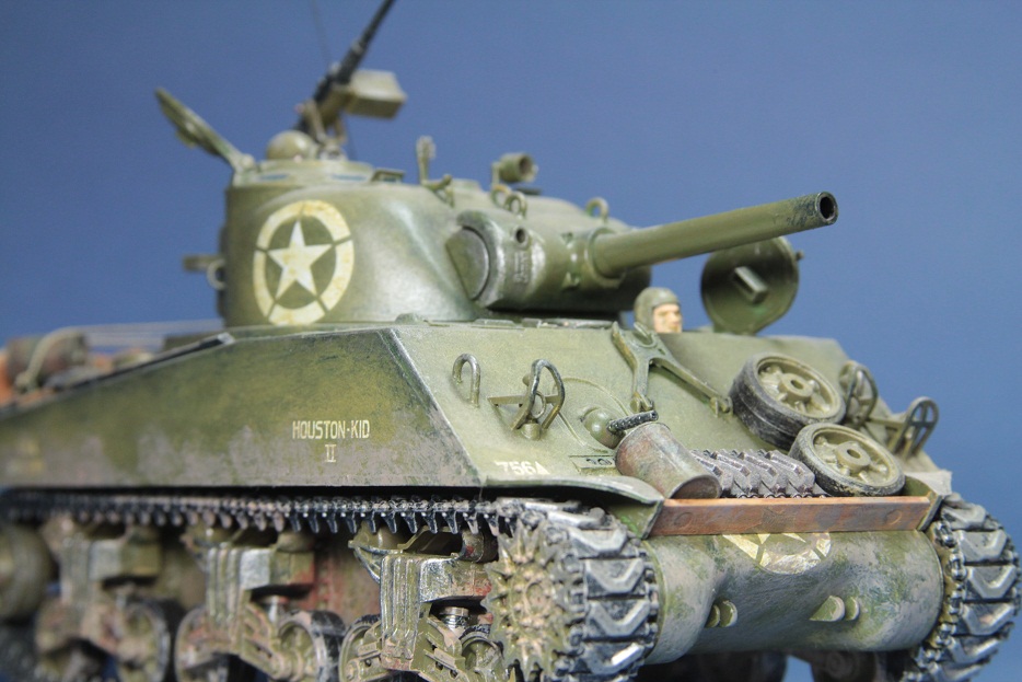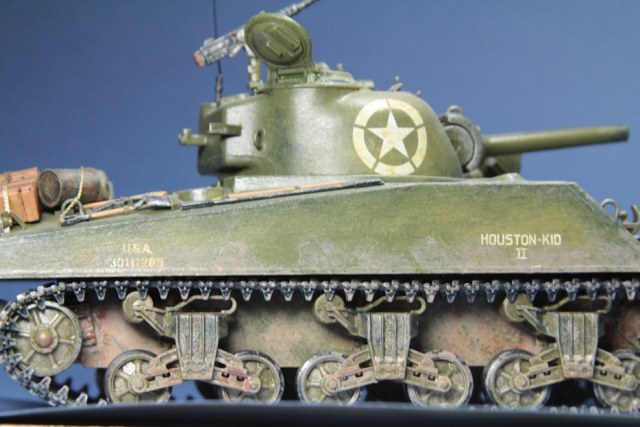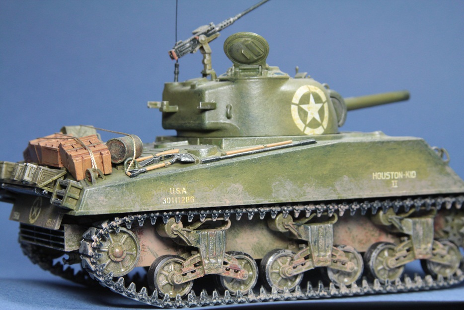 защиты не было да и не на всех шерманах она была! а траки потёрты только в нужных места специально фоты изучал вот только по неопытности пытался изобразить грязь вот она и похожа на фото как потёртость.....