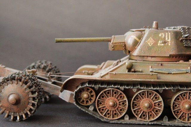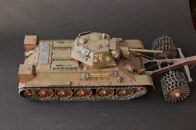 Ну вот ещё одна модель из старых запасов построенная в начале моего увлечения моделизмом (ВСЕХ ТОНКОСТЕЙ ЕЩЁ НЕ ЗНАЛ НА ТОТ МОМЕНТ).... что можно про неё сказать собиралась просто полностью из коробки косяков куча :( траки поставил наборные от макета но получились они не очень, пытался изобразить фару. Красился эмалями звезда кистью, пытался его запачкать.