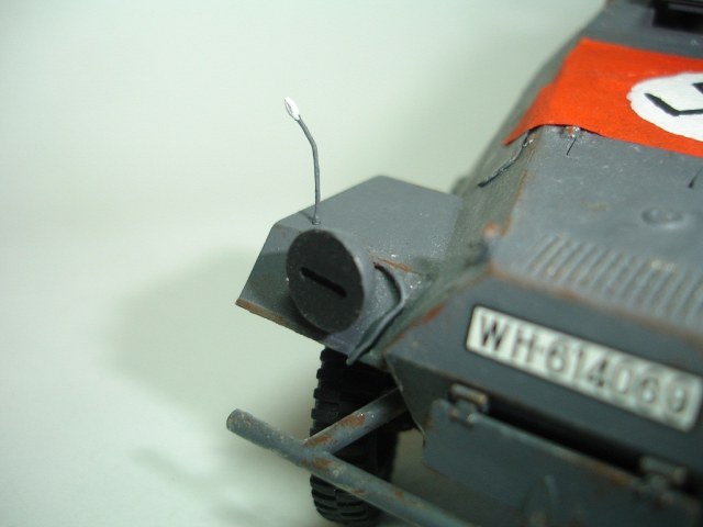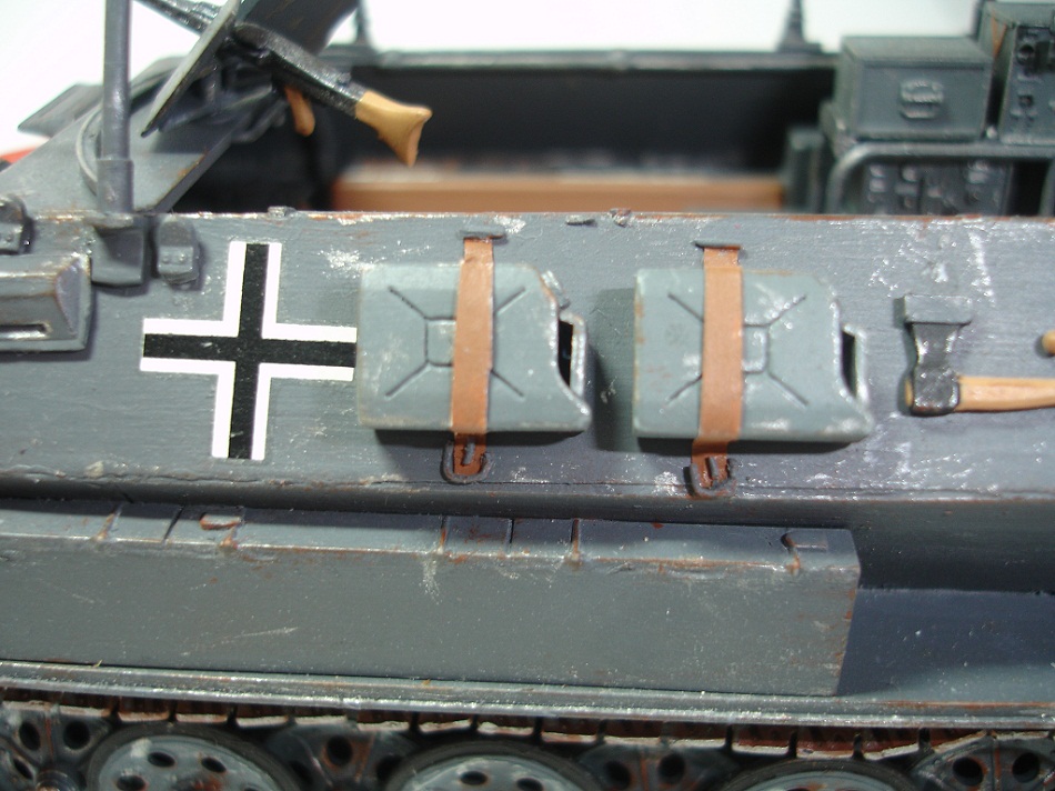 Из доработок: сделал проводку к фарам, крепления для запасных траков, пришлось сделать правый габаритный ус (который без зеркала) самому, т.к. отделяя деталь от литника, я случайно её сломал, ну и наконец это ремни для канистр и замочки на ремни.