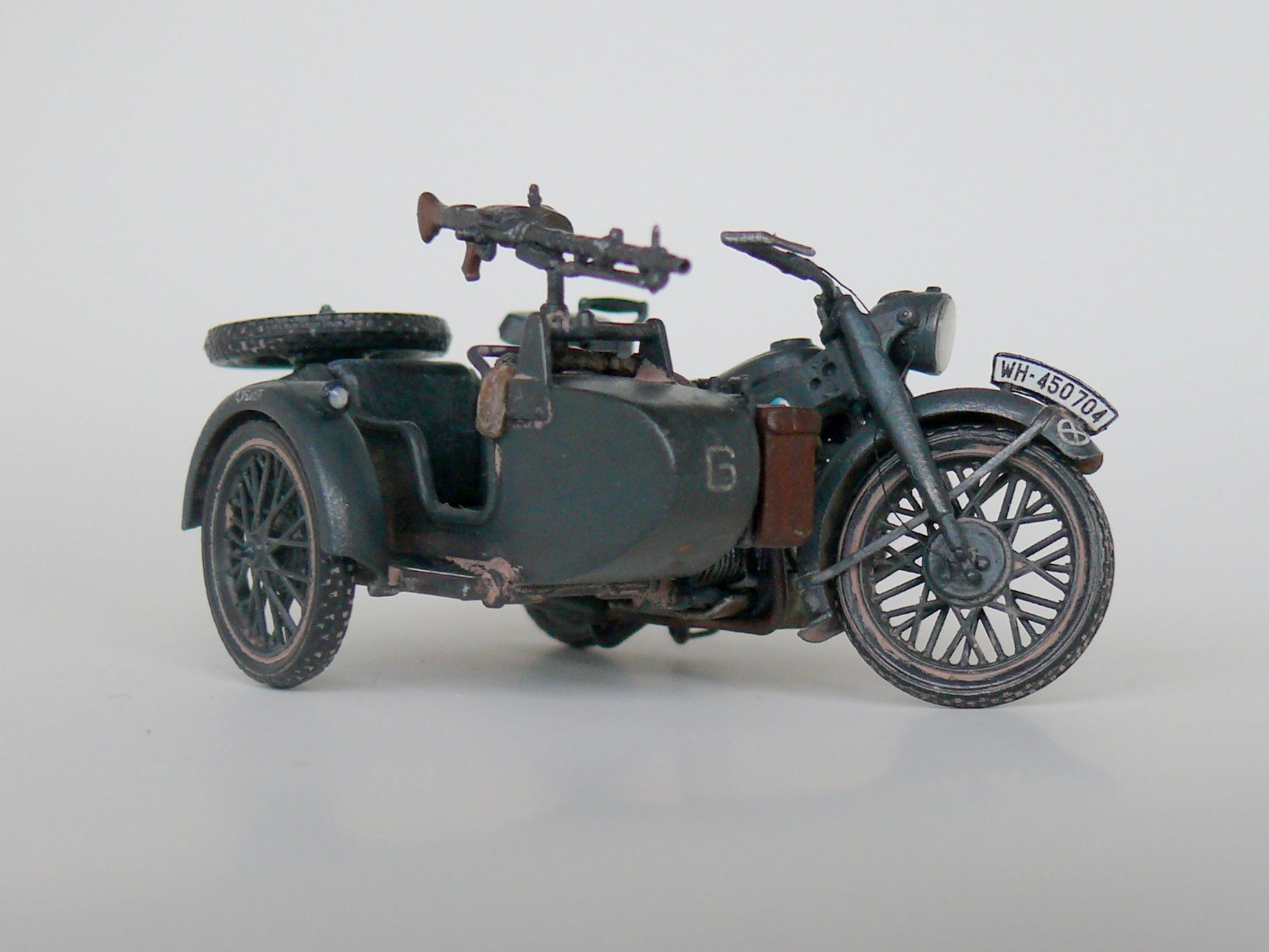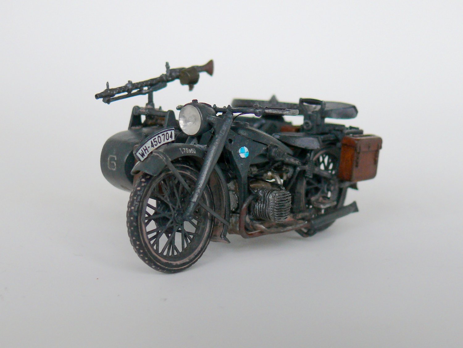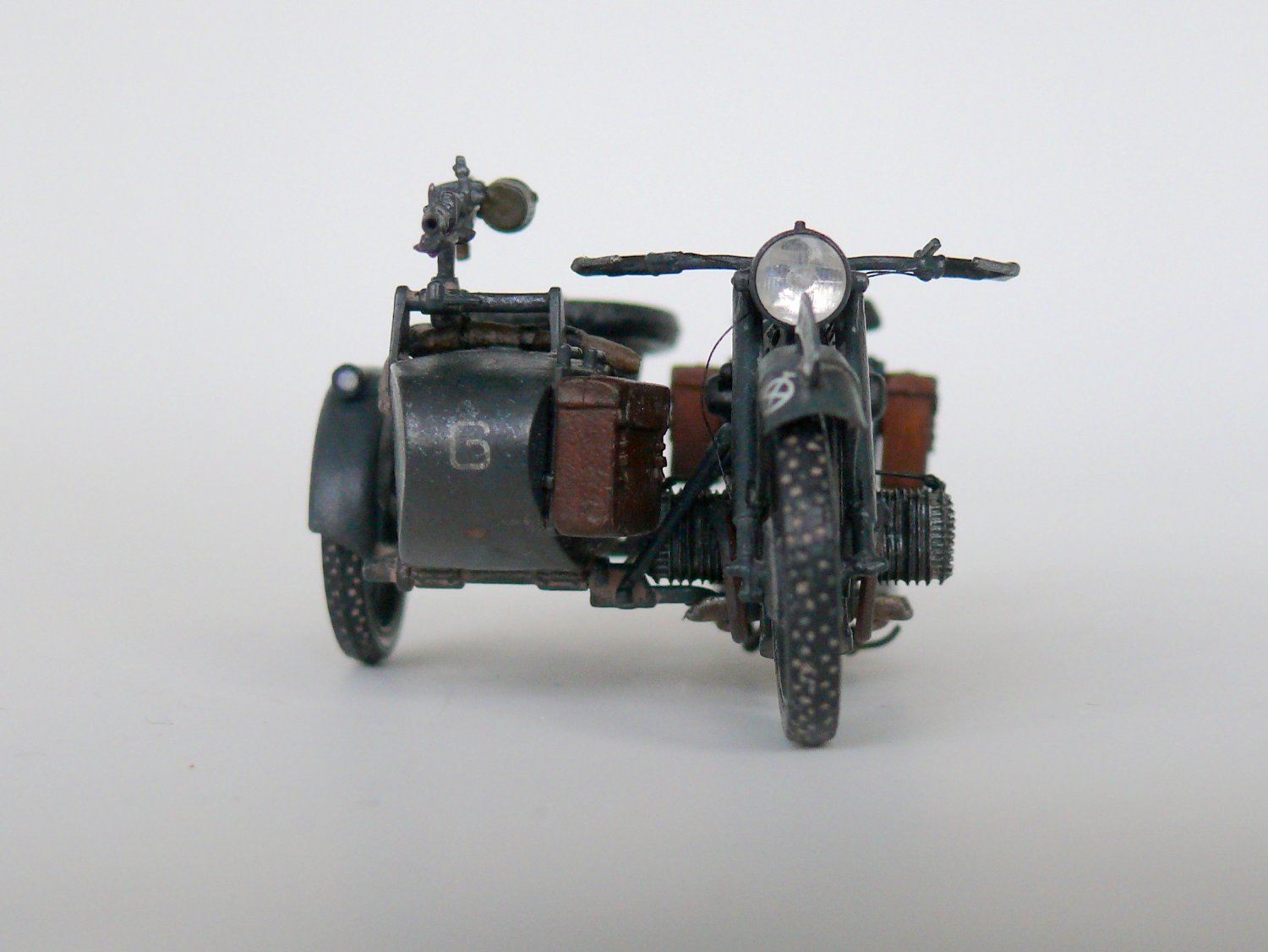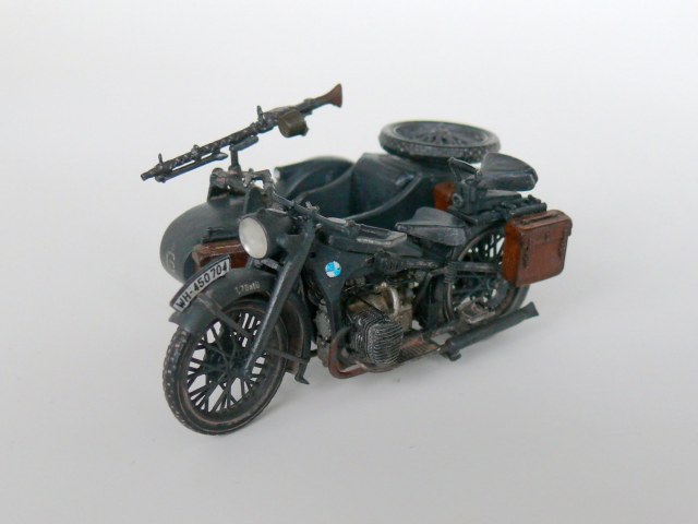 Добрый день уважаемые коллеги.Подустав от запилов решил отдохнуть и собрать просто из коробки,благо качество просто супер,в итоге не удержался и заменил фару на эльф,сделал проводку,аккамулятор и бензопровод,в коляске срезал иммитацию настила и изготовил заново из спичек, фонарь коляски из обрезка прозрачного пластика,иммитация скатки на коляске.Вроде все.Спасибо за внимание.