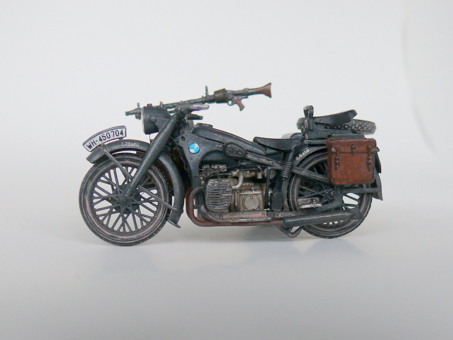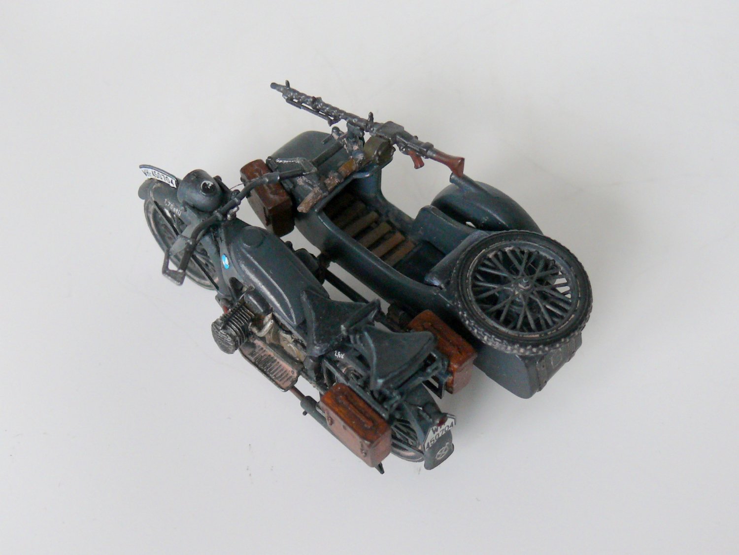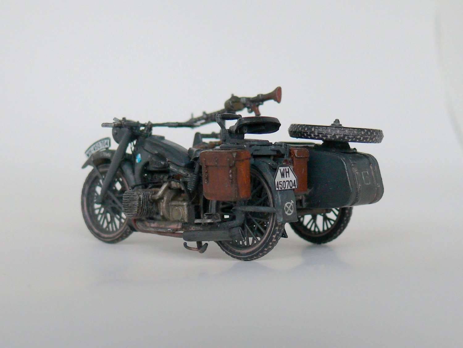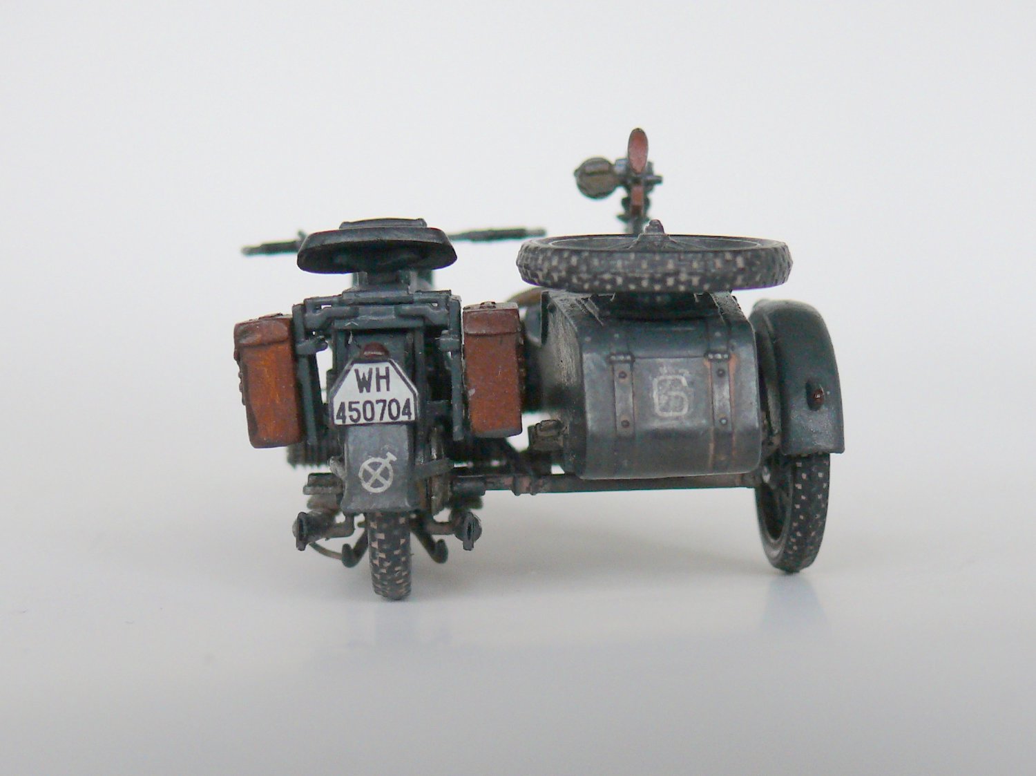 Добрый день уважаемые коллеги.Подустав от запилов решил отдохнуть и собрать просто из коробки,благо качество просто супер,в итоге не удержался и заменил фару на эльф,сделал проводку,аккамулятор и бензопровод,в коляске срезал иммитацию настила и изготовил заново из спичек, фонарь коляски из обрезка прозрачного пластика,иммитация скатки на коляске.Вроде все.Спасибо за внимание.