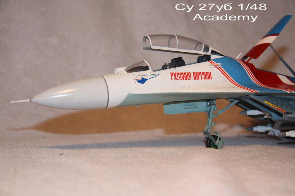 По модели, флаг на киле выполнен хорошо, кабина тоже выглядит красиво, да и вообще моделей в старой витязёвской окраске тоже не так много, за это плюс. Но в цвета камуфляжа не попали совсем, слишком много лишнего глянца, очертания носовой части не похожи сами на себя, и уже отмеченная выше небрежность в отношении окраски колёсных ниш и створок это большие минусы, тем более для 48го масштаба.