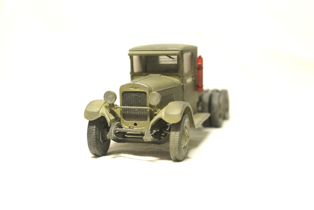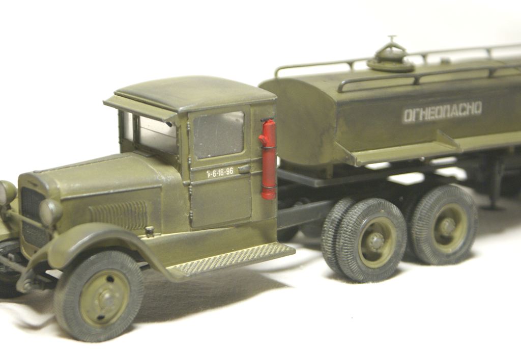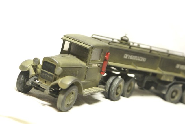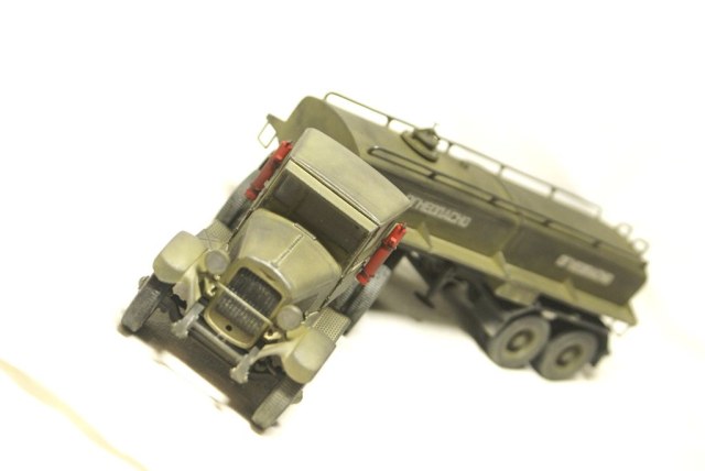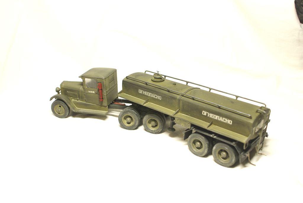 Да нет истории, "липил по фактической погоде".Специально купил только два ВЭшных бензовоза, и то только из за цистерн, и заливной горловины. Перепилил два Макетовских ЗИС-6, разные "сладкие остатки" от предыдущего трейлера. Ну и кой чего от ТАМИИ использовал. За мат.частью не гнался (сёдла ваще раньше не такие были, совсем не давно узнал) Если БЗ-35, делал по чертежам, с линеечкой высчитывал реальные размеры к 35му масштабу модели ( с поправкой на мою внимательность). То здесь чистой воды импровизация. А на счёт прототипа...ответ во в торой части названия модели.... я думаю не вытянул бы ЗИСок столько топлива в цистерне. Выдумка это всё, плод моего больного воображения))))