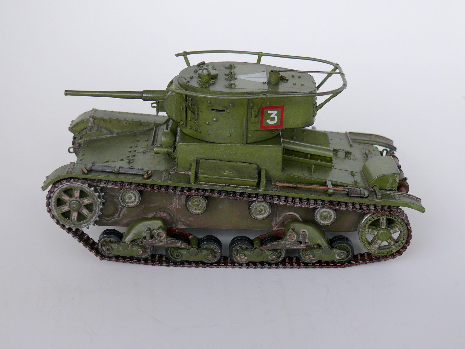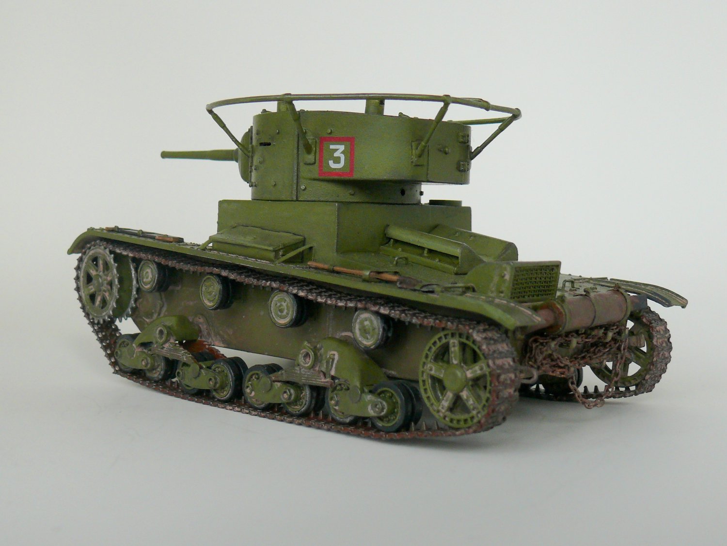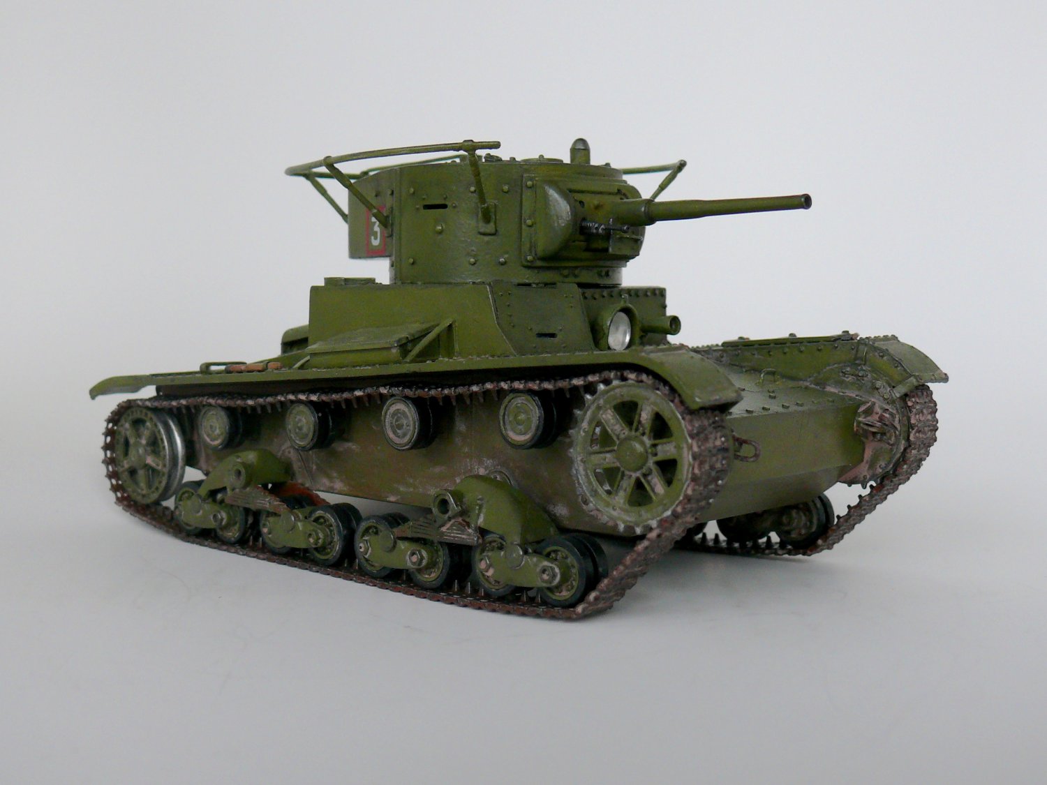 Еще один образец советской довоенной техники в моем исполнении.Спасибо Звезде за перевыпуск,очень хотелось иметь его в своей коллекции. На мой взгляд модель не так уж плоха,а гусеницы так просто великолепны. В общую геометрию не лез, попытался исправить лишь внешние косяки звезды: заменил заклепки на лобовой части и башне,добавил недостающие;Пулемет самодел из иглы; доработал глушитель; немного подправлена хордовая часть; маска орудия перепилена на штампованую ну и еще кое какие мелочи. Окраска кисть.Спасибо за внимание.