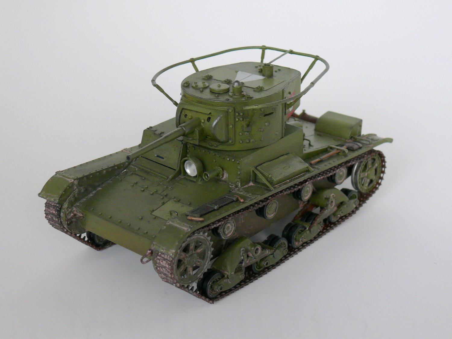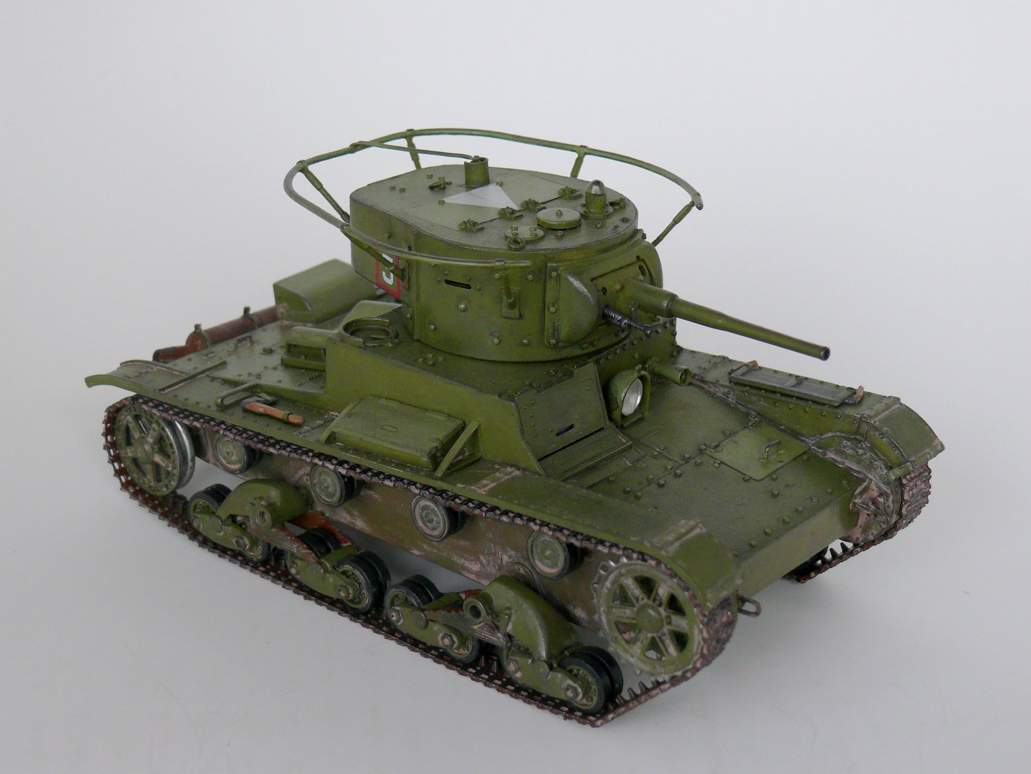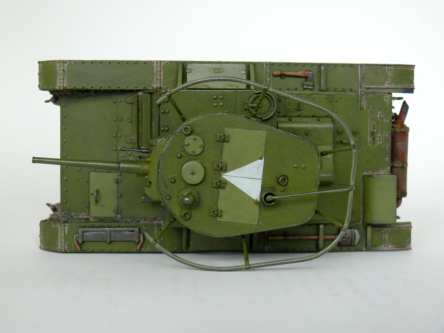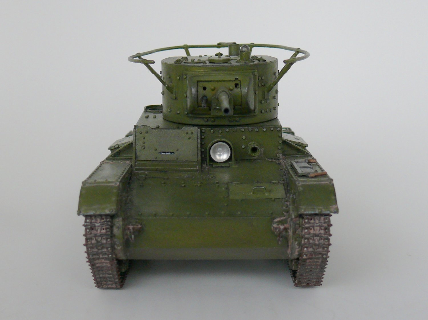 Заклёпки не стоило менять, Вы их переразмерили. А вот ручки на люки надо проволочные. На петлях всех были тоже маленькие заклёпки, их очень легко воспроизвести капельками акрилового клея зубочисткой. Пилу оторвите и выбросте, такой укладки по фото не известно. Пила лежала в деревянном пенале, посмотрите последний № М-Хобби. И лопата, и фара, и топор крепились гайками-барашками - сам только что сделал этот Т-26, вот и расписываю. К фаре надо добавить проводку.