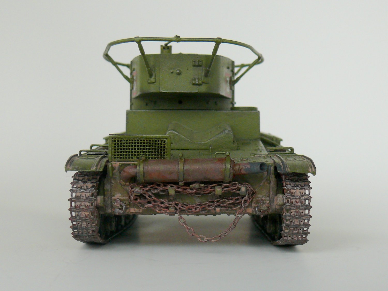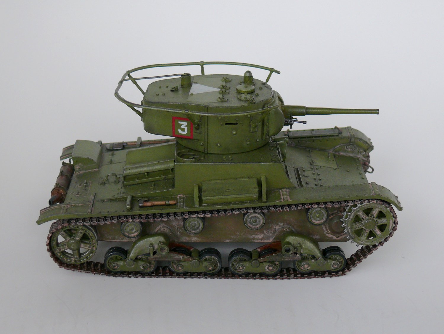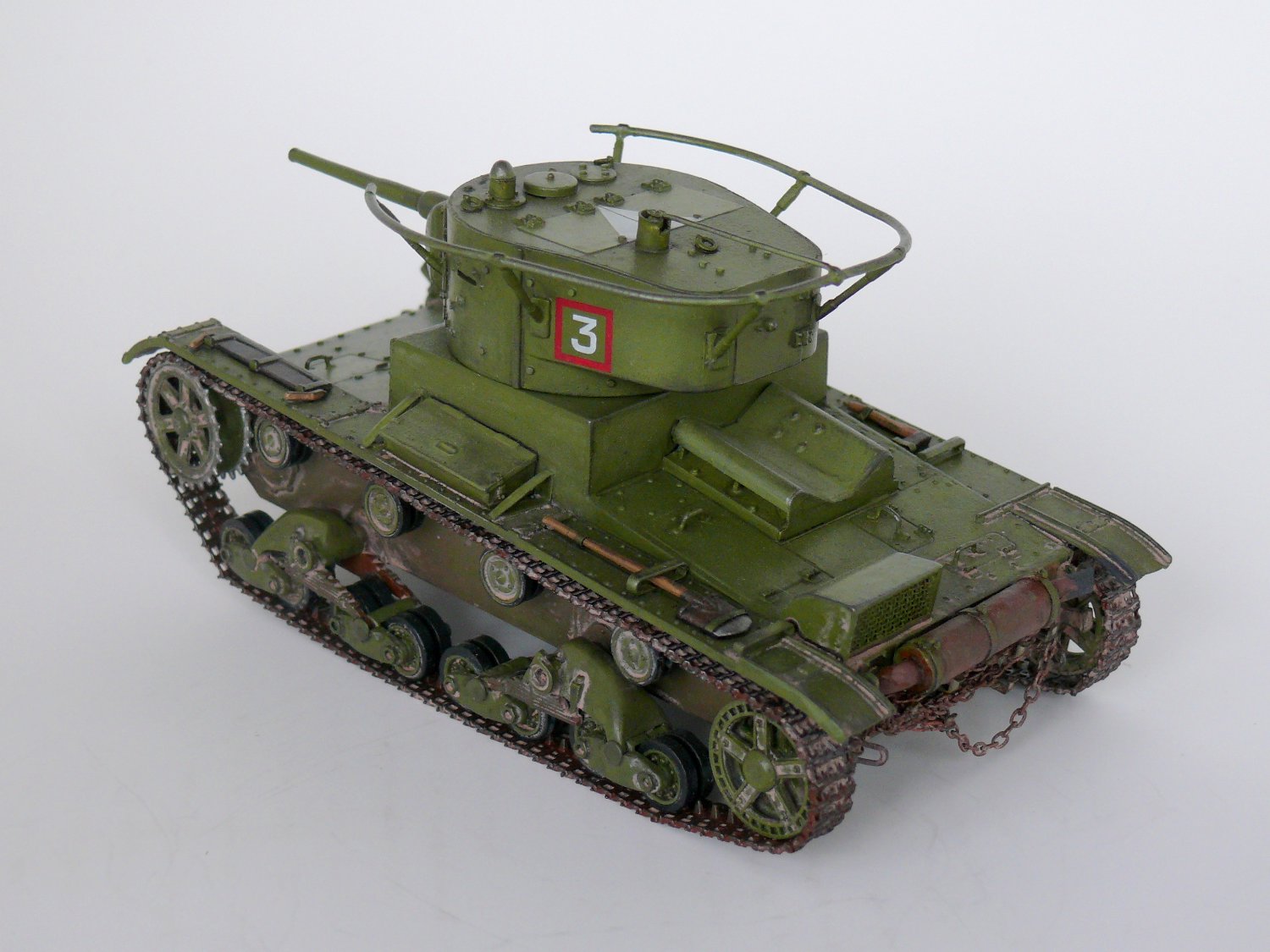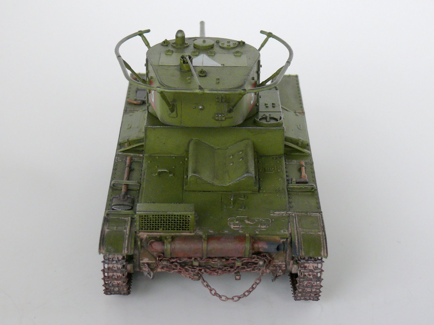 Заклёпки не стоило менять, Вы их переразмерили. А вот ручки на люки надо проволочные. На петлях всех были тоже маленькие заклёпки, их очень легко воспроизвести капельками акрилового клея зубочисткой. Пилу оторвите и выбросте, такой укладки по фото не известно. Пила лежала в деревянном пенале, посмотрите последний № М-Хобби. И лопата, и фара, и топор крепились гайками-барашками - сам только что сделал этот Т-26, вот и расписываю. К фаре надо добавить проводку.